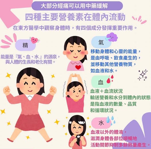 當精、氣、血、水能夠和諧運行,身體自然維持穩定。若其中一環失調,就可能出現各種症狀,例如經痛。透過中藥調理,可以協助恢復平衡,改善經期不適。